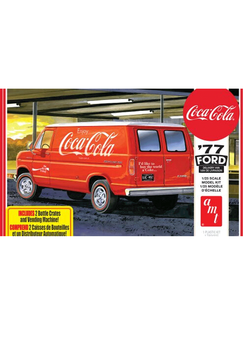 Have a Coke and a smile with AMT’s 1/25 scale Ford Van model kit! This authentic service van replica has all the accurate details expected in an AMT kit. This value-packed special version, with it’s Coca-Cola theme, includes special bonuses: a complete “mini kit” of a vintage 1970s vending machine AND two-scale bottle crates, molded-in authentic Coke bottle green! An authentic decal sheet is included with Coke graphics to decorate the van, vending machine, and the crates! Eye-catching illustrated packaging makes this an attractive gift for the Coke collector in your life. A perfect project for a rainy day or anytime! Enjoy the thrill and satisfaction of building something with your hands. Add this AMT kit to your collection today!