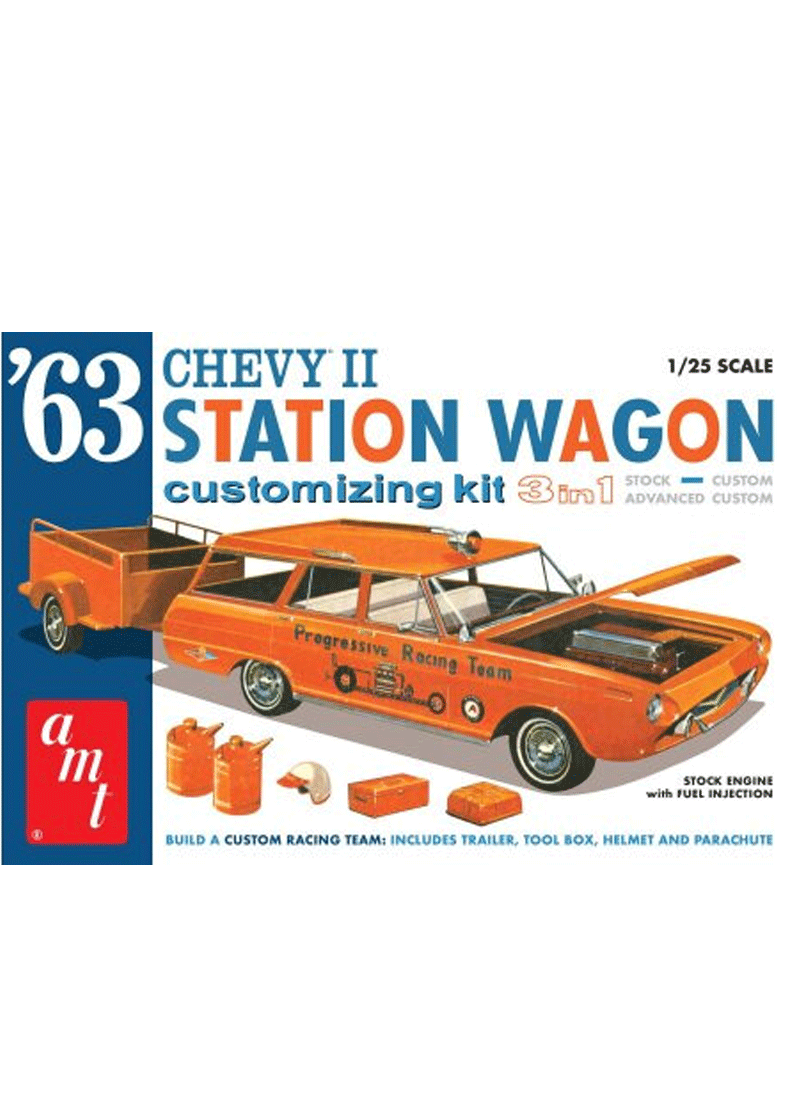 OPTIONS GALORE: The 1963 Chevy II Station Wagon customizing kit is loaded with options! Fully paintable, the model kit can be built as a stock, custom, or advanced custom wagon. Features include NEW tooling, pull-behind trailer, 5 engine options, engine display stand, whitewall tires, custom and stock chrome wheels, racing accessories, and a NEW water-slide decal sheet loaded with colorful options—all wrapped up in eye-popping, vintage-style packaging!