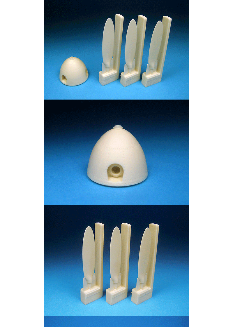 This set contains a new resin prop and spinner to replace the kit items in the Revell kit or any 109 from the F-4 through the G-14. Our resin spinner is very accurate in shape and detail. The misshapen kit blades are replaced with very accurate resin versions which will make a big improvement in the look of your finished model. Easy to install. Can be adapted to fit the Hasegawa and Trumpeter kits as well.