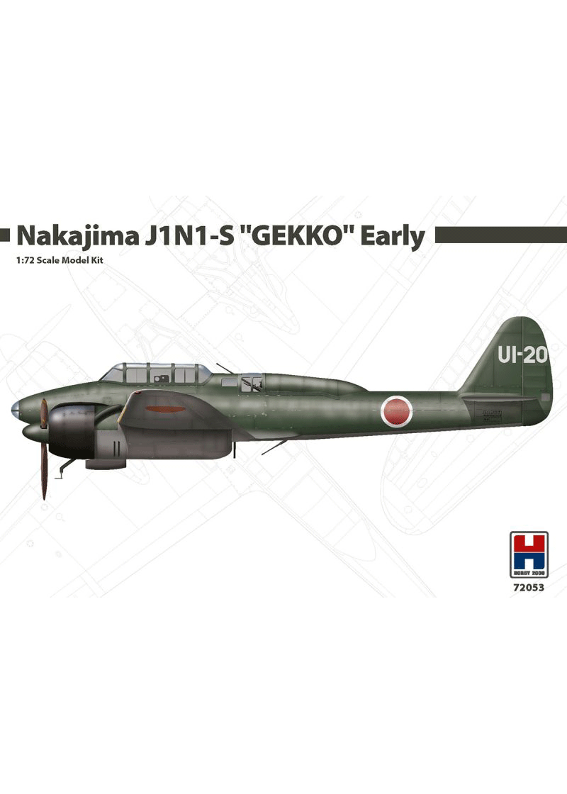 Unassembled plastic model kit in 1/72 scale of a Japanese WWII Nakajima J1N fighter aircraft. J1N1 was a twin engined Imperial Navy aircraft used for reconnaissance, long range fighter, night fighter or kamikaze missions. Introduced in 1942, few less of 500 units were produced. J1N1-S was a night fighter variant, armed with 4 forward 20mm guns (type 99 guns), two up firing and two down/under firing. Later models suppressed the under fire guns adding a third up forward gun. other variants without nose antennae or searchlight also added a nose 20mm gun.