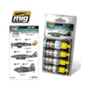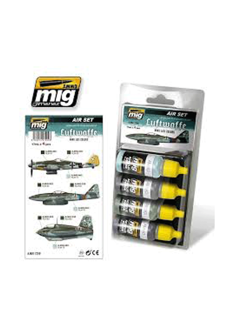 During the autumn of 1944, as a result of losts German air superiority against Allied forces, the Luftwaffe adopted green colours for its aircrafts upper surfaces. With this change airplanes were better camouflage while flying over and hidden under the European forest. These colours have been the object of controversy and have caused a lot of headaches to numerous modellers. This set will solve the problem with accurate colours without need of complex mixtures. The colours are accurately and slightly lightened for scale reduction effect of any kit. All products are acrylic and are formulated for maximum performance both with brush or airbrush. Water soluble, odourless, and non-toxic. Shake well before each use. Each jar includes a stainless steel agitator to facilitate mixture. We recommend A.MIG -2000 Acrylic Thinner for correct thinning. Dries completely in 24 hours. Included colours: A.MIG-0925 RLM 83 OLIVE DRAB DARK, A.MIG-0206 RLM 81 – FS 34079, A.MIG-0230 RLM 82 CAMO GREEN, A.MIG-0063 RLM 76 PALE GREY