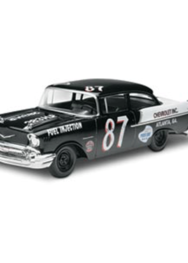 Thanks to its low curb weight and high curb appeal, the Chevy 150 was extremely popular with hot rodders. Chevy embraced the racing pedigree of the 150 with the “Black Widow” racing stock car. These non-production cars were built by Southern Engineering and Development Company-a special builder set up by GM. All “Black Widows” were based on the 1957 150 Utility Sedan. Many proved highly successful, with wins at the National Championship and elsewhere. Kit features option to build as factory stock 150 Utility Sedan or Black Widow, choice of stock single carb or fuel injection engine, six lug stock wheels with dog dish hub caps, and soft black tires.